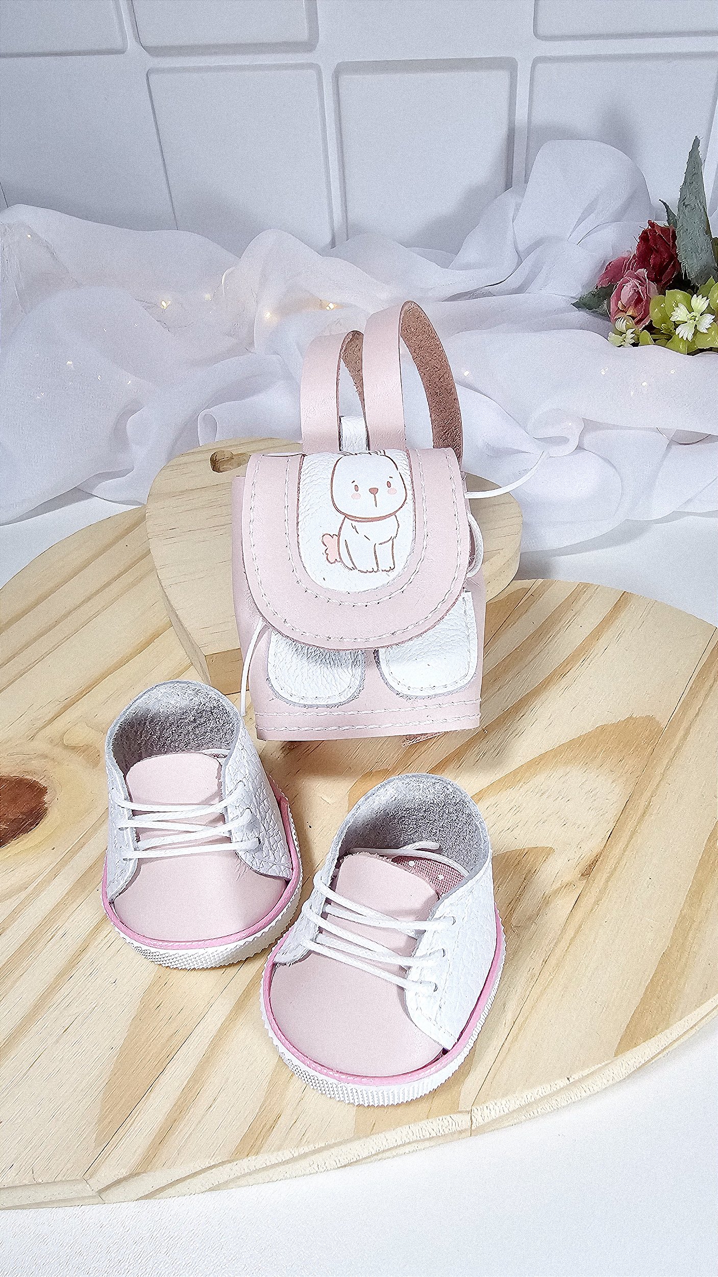 Conjunto de mochila e tênis em couro legítimo nas cores branco e rosa com tema coelho.